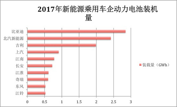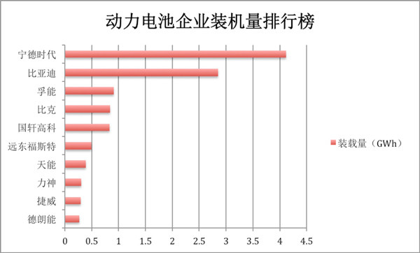 與新能源乘用車銷量相對應的,比亞迪、北汽新能源與吉利以2.85GWh、2.42GWh和1.99GWh位列動力電池裝機量前三。