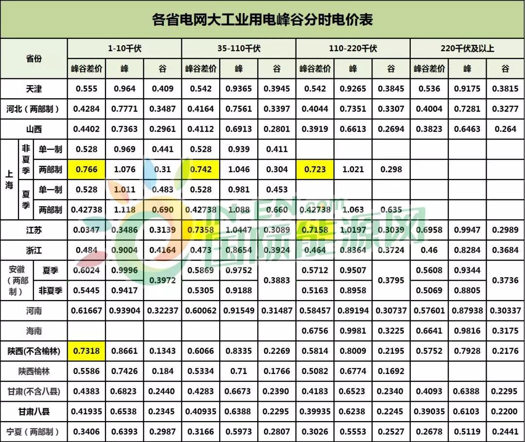 “110-220千伏”的峰谷差價超過0.7元的省份上海(非夏季、兩部制),為0.723元,江蘇為0.7158元。