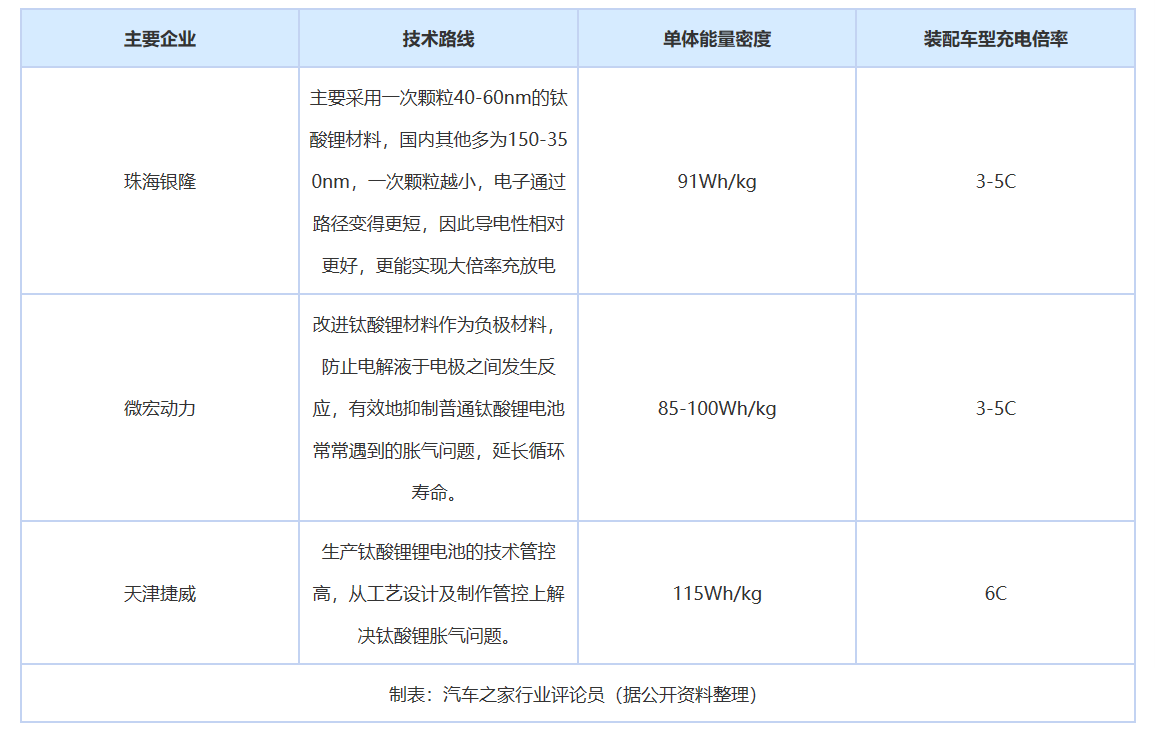 鈦酸鋰動力電池是以負(fù)極材料命名,正極采用三元材料,以珠海銀隆、微宏動力、天津捷威為典型企業(yè)。從性能來看,鈦酸鋰電池的低溫性能優(yōu)越、安全性和循環(huán)使用性能較好,作為快充電池的倍率性能也得到業(yè)界的肯定。但是鈦酸鋰目前突出的問題有兩點(diǎn):其一,能量密度相對較低,在政策、市場均要求不斷提升能量密度的壓力下,當(dāng)前鈦酸鋰的市場份額在整個動力電池市場中占比較低。其二,受高成本的小金屬材料如鈦、鎳、鈷的影響,鈦酸鋰電池成本明顯要高于其他體系。