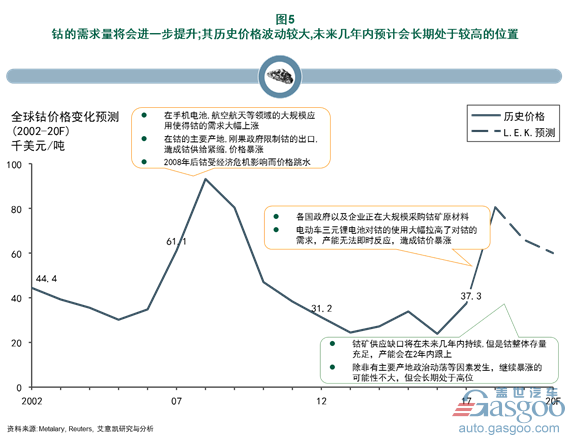 為此,我們預(yù)計(jì)在2019年之后,除非有特殊因素的影響(例如,主要產(chǎn)地剛果的局勢(shì)不穩(wěn)定性),鈷的價(jià)格會(huì)穩(wěn)定并且回落,只是無(wú)法回落到2017年之前的低點(diǎn)。長(zhǎng)期來(lái)看,對(duì)汽車動(dòng)力電池企業(yè)仍然應(yīng)該加強(qiáng)對(duì)上游資源的把控,適當(dāng)進(jìn)行投資。