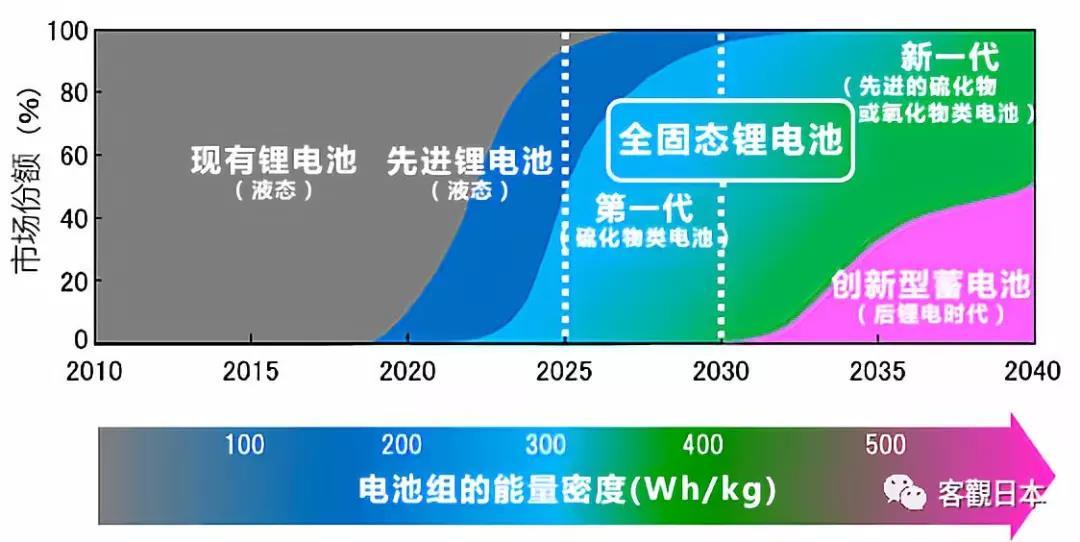 豐田2010年,正式推出硫化物固態(tài)電池,到2014年,實驗室的固態(tài)電的能量密度已經(jīng)達(dá)400Wh/kg。