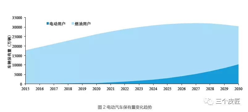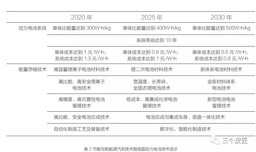 通過整理近期上市的騰勢(400)、北汽EU400、上汽榮威ERXEV400 等車型數(shù)據(jù)不難發(fā)現(xiàn),較老款車型新上市電動車型動力電池容量有較大增加。北汽EU 400 在保持售價與老款EU 260 基本持平的情況下,采用了孚能三元材料鋰電池,電池容量達到54.4 千瓦時(+31.4%),能量密度達到125Wh/kg,標(biāo)定續(xù)航里程360 公里(+38.5%),60km/h 等速行駛工況下續(xù)駛里程可達到460 公里;秦2017 款圖 2 電動汽車保有量變化趨勢插電式混合動力車型電池組容量達到17 千瓦時(較2015 款車型提高31%),純電動續(xù)航里程達到100 公里(較2015 款車型提高43%)。表2 為《節(jié)能與新能源汽車技術(shù)路線圖》中動力電池技術(shù)分階段發(fā)展目標(biāo),到2030 年動力電池單體比能量Ⅴ 將達到500 瓦時/ 千克,是目前水平的2 倍以上 。