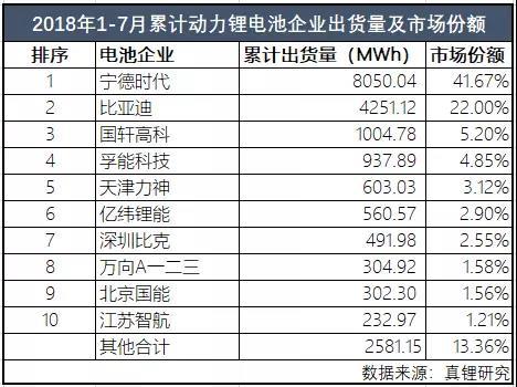 7月共有48家電池企業(yè)實(shí)現(xiàn)裝機(jī),比6月又減少了10家。月度出貨量排行榜中,寧德時(shí)代和比亞迪依然分列一二排名,當(dāng)月市場(chǎng)份額分別達(dá)40.81%和23.69%,二者合計(jì)執(zhí)掌國(guó)內(nèi)六成多的動(dòng)力電池市場(chǎng)。天津力神位列第三,市場(chǎng)份額7.5%。