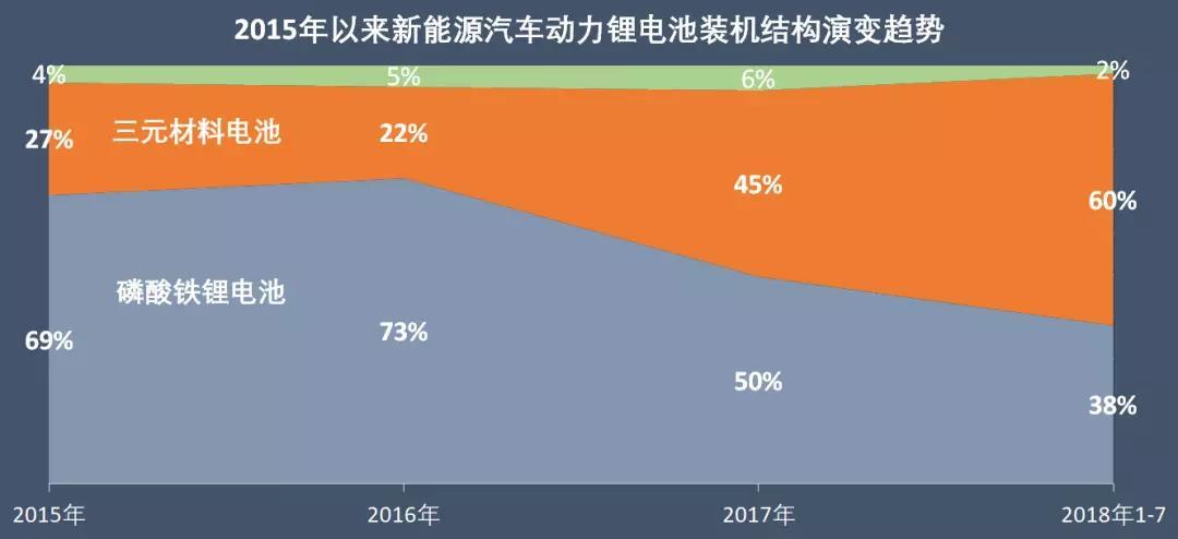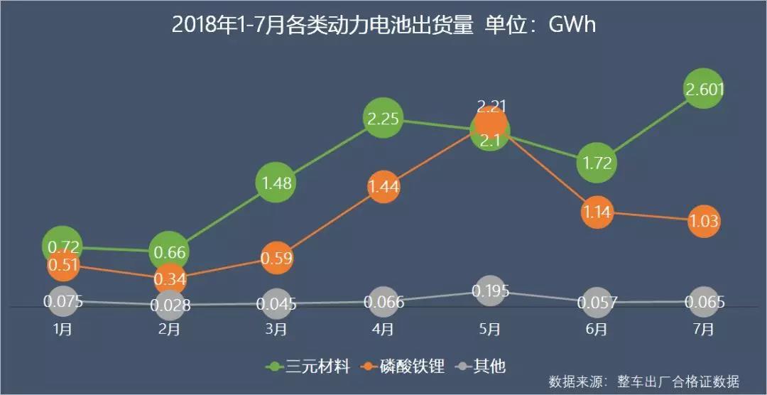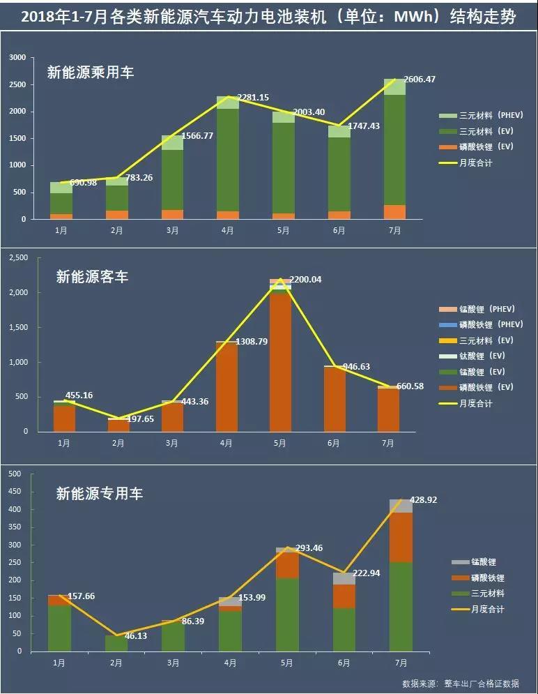 分析2015年以來新能源汽車各類動(dòng)力電池裝機(jī)結(jié)構(gòu)的演變,可以發(fā)現(xiàn)三元材料走強(qiáng)已是明顯的趨勢(shì)。不過,這一格局的演變系乘用車市場(chǎng)的走強(qiáng)和客車市場(chǎng)的疲軟雙向作用造成——三元材料電池的裝機(jī)大戶是新能源乘用車,而新能源客車是磷酸鐵鋰電池的裝機(jī)大戶,2018年以來尤其是6、7月份,新能源客車市場(chǎng)持續(xù)低迷,其在磷酸鐵鋰電池市場(chǎng)的高權(quán)重造成了該類型裝機(jī)量的連續(xù)下行,變相也推高了三元材料電池的出貨比重。