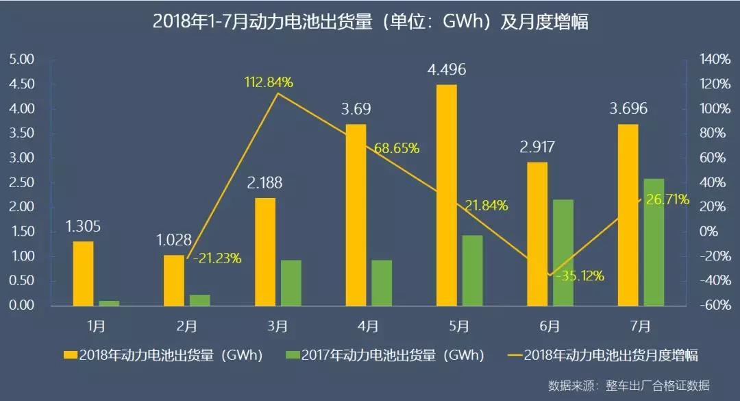 受整車產(chǎn)量回升影響,7月份國(guó)內(nèi)動(dòng)力電池出貨調(diào)轉(zhuǎn)跌勢(shì),以26.71%的月增幅達(dá)到3.696GWh,同比增幅也上升至42.8%,出貨量與4月份相當(dāng),但較補(bǔ)貼新政實(shí)施前的5月還有不小差距。7月動(dòng)力電池出貨的增量主要來自新能源乘用車。