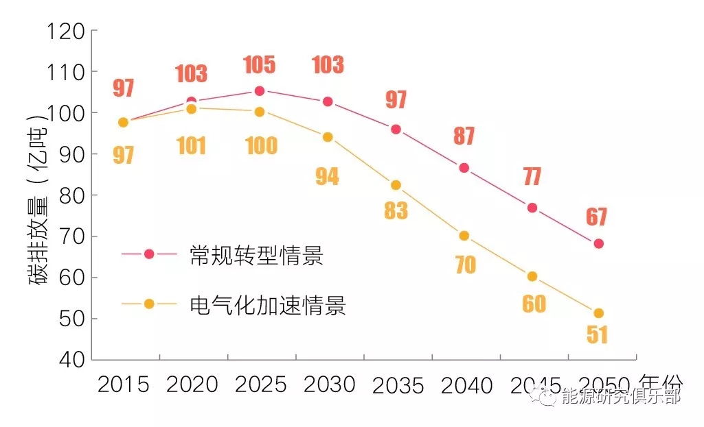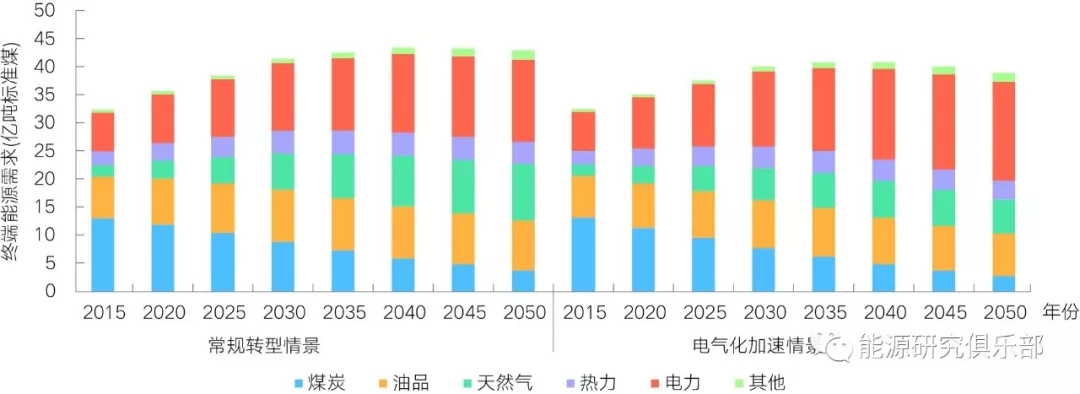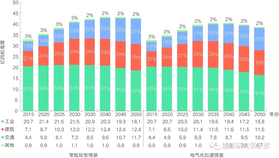 五是煤炭需求已進入下降通道,清潔高效利用勢在必行。煤炭需求已進入下降通道,峰值出現(xiàn)在2013年,峰值消費量28億噸標準煤。常規(guī)轉(zhuǎn)型情景下,煤炭需求在經(jīng)歷峰值平臺期后較快下降,2030年降至24.4億噸標準煤,2050年降至10.0億噸標準煤。電氣化加速情景下,煤炭需求下降速度更快,2030年需求降至22.6億噸標準煤,2050年降至7.2億噸標準煤。隨著煤炭清潔高效利用步伐加快,終端散煤利用逐步轉(zhuǎn)為發(fā)電供熱集中利用,終端煤炭需求和污染物排放將大幅下降。