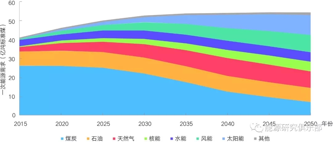 一是能源需求增速放緩,總量將較快進入平臺期。中國終端能源需求即將進入增長飽和階段,2035~2040年前后達到峰值后緩慢下降。一次能源需求2020~2025年進入增長飽和階段,約在2030年后進入平臺期,總量穩(wěn)定在56~58億噸標準煤,其中化石能源需求在2025年前后達到峰值41~43億噸標準煤。如果按照電熱當量法計算可再生能源發(fā)電量,則一次能源需求將在2030~2035年達到峰值,峰值降至47~50億噸標準煤,如圖1。