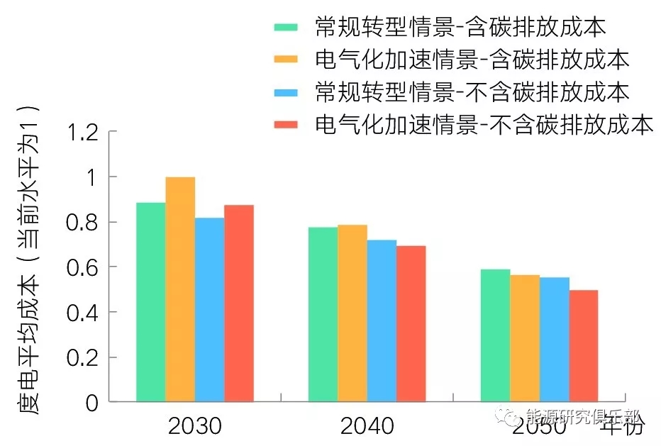 八是電力系統(tǒng)成本將呈現(xiàn)先升后降趨勢。當前至2030年,電力需求保持較快增長,且新能源發(fā)電等新技術(shù)仍處于發(fā)展期,電力系統(tǒng)總成本持續(xù)上升。2030-2050年,電力需求增長逐漸趨于飽和,新能源發(fā)電等技術(shù)日益成熟,系統(tǒng)成本進入下降期,此階段能源發(fā)展的低碳性目標與經(jīng)濟性目標逐漸重合。相比于電力系統(tǒng)總成本,度電平均成本的達峰時間更早,預計2050年度電成本約為當前水平的一半左右,如圖13。