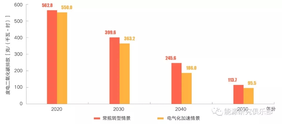 九是電力行業(yè)碳排放強度將大幅降低。隨著清潔能源發(fā)電量占比逐漸提升,電力行業(yè)碳排放總量在2025年前后出現(xiàn)峰值,峰值水平約為42億噸。2050年排放量降至14億噸,占全國碳排放的比重降至30%以下。單位電量碳排放強度方面,常規(guī)轉(zhuǎn)型情景與電氣化加速情景下2030年分別降至400克/千瓦時、363克/千瓦時左右,2050年分別降至114克/千瓦時、96克/千瓦時左右,低于當前水平的五分之一,如圖14。