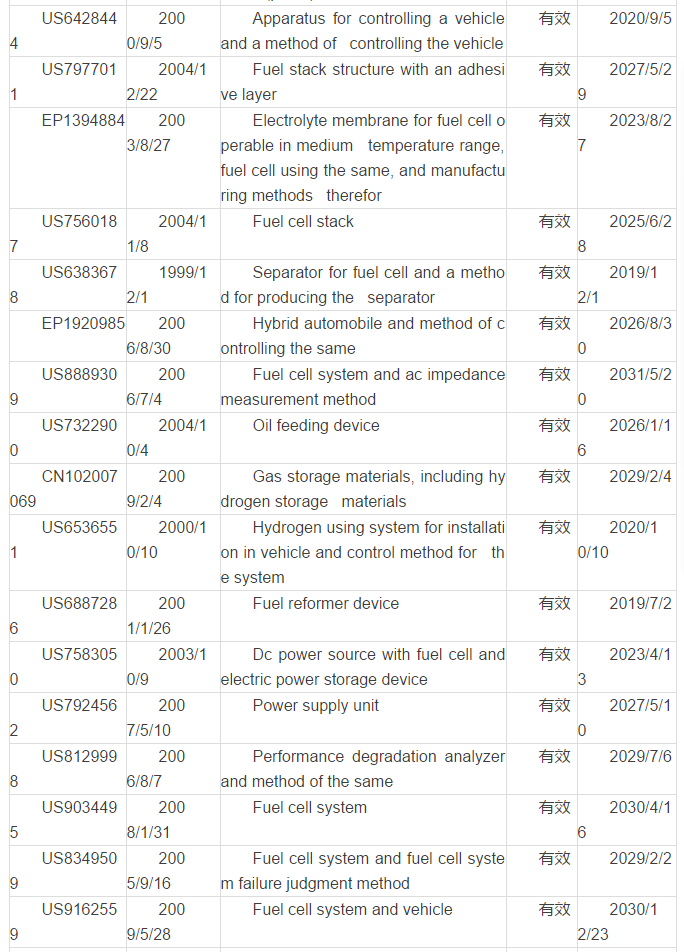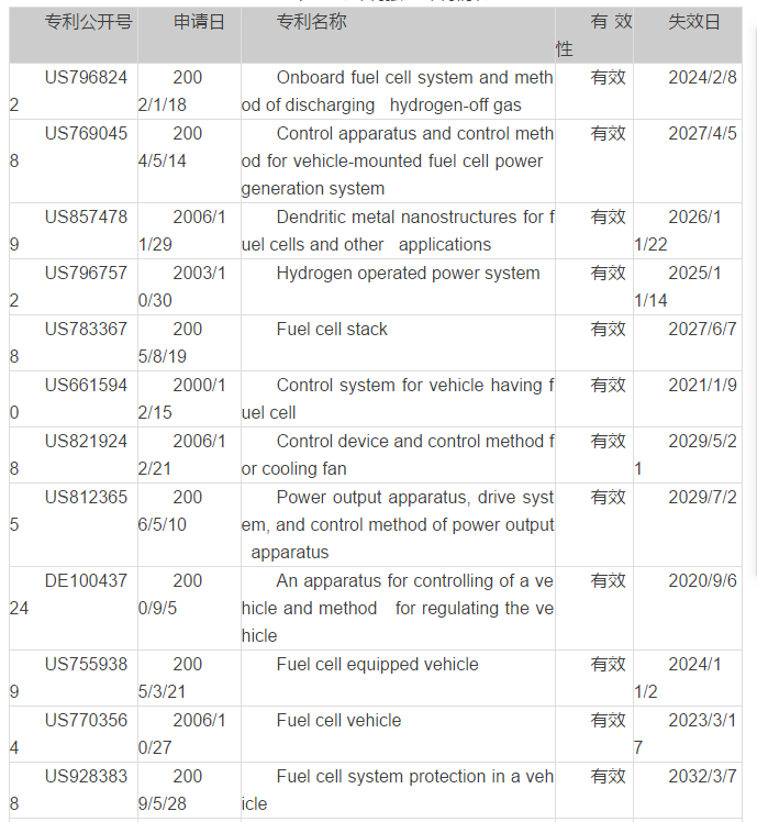 對(duì)豐田汽車(chē)的所有與燃料電池相關(guān)的專(zhuān)利族進(jìn)行專(zhuān)利強(qiáng)度分析,發(fā)現(xiàn)其專(zhuān)利強(qiáng)度超過(guò)90的專(zhuān)利有88件,涉及氫燃料電池控制系統(tǒng)、燃料電池堆、冷卻裝置、燃料電池制造等。88件專(zhuān)利全部有效,僅有3件專(zhuān)利將在2020年前失效。