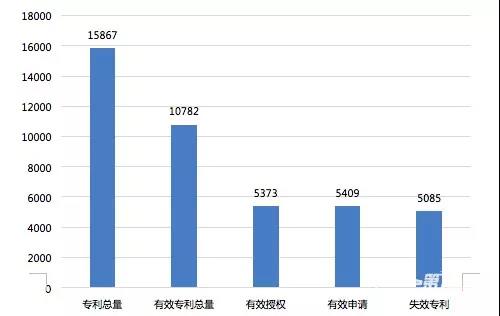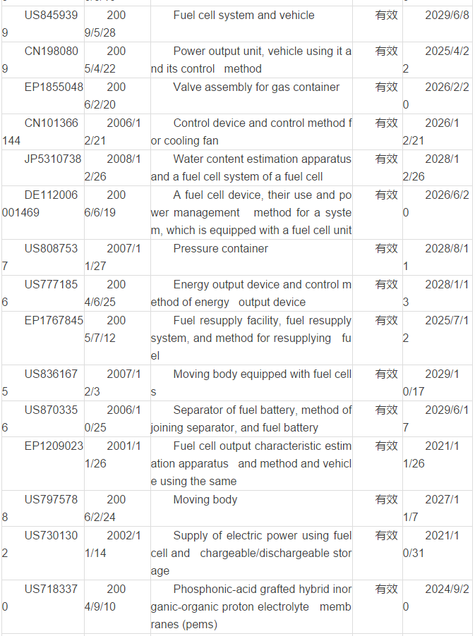 下圖顯示,豐田汽車(chē)與燃料電池相關(guān)的專(zhuān)利總量為15867件,其中,10782件專(zhuān)利是有效的,包括5373件有效授權(quán)和5409件有效申請(qǐng)。豐田汽車(chē)失效專(zhuān)利數(shù)量較少,僅為5085件,占專(zhuān)利總量的32%。