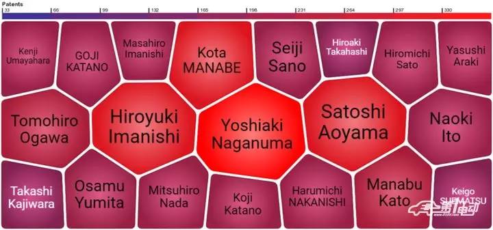 豐田汽車(chē)與燃料電池相關(guān)技術(shù)的高產(chǎn)發(fā)明人包括Yoshiaki Naganuma、Satoshi Aoyama、Hiroyuki Imanishi、Kota MANABE和Manabu Kato等,其中發(fā)明人包括Yoshiaki Naganuma的專(zhuān)利申請(qǐng)328件,占公司專(zhuān)利總量的2.1%。申請(qǐng)量排名前10發(fā)明人是公司技術(shù)研發(fā)核心團(tuán)隊(duì),申請(qǐng)專(zhuān)利1940項(xiàng),占公司專(zhuān)利總量的12.2%,說(shuō)明公司科研團(tuán)隊(duì)龐大,科研人才較多。