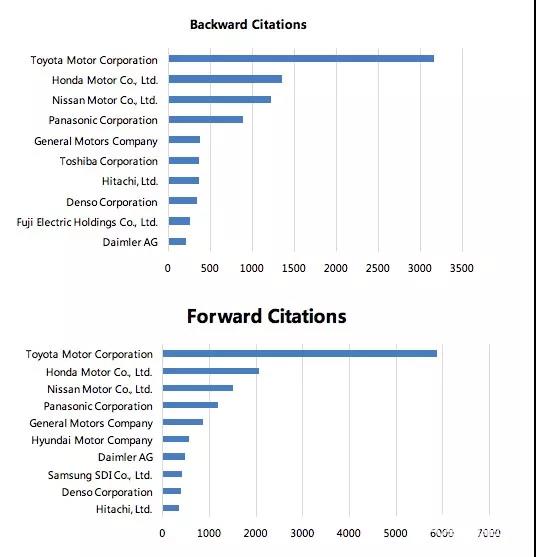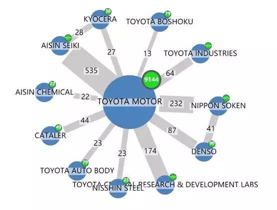 對(duì)豐田汽車(chē)申請(qǐng)的與氫能和燃料電池相關(guān)專(zhuān)利進(jìn)行申請(qǐng)人分析,其結(jié)果顯示了該企業(yè)與其他企業(yè)或個(gè)人的合作研發(fā)情況。由下圖可以看出,公司與愛(ài)信、Nippon Soken、豐田中央研發(fā)實(shí)驗(yàn)室等集團(tuán)內(nèi)外部企業(yè)和科研機(jī)構(gòu)有大量合作。技術(shù)的借鑒方面,本田汽車(chē)與氫燃料電池相關(guān)的專(zhuān)利被本田汽車(chē)、日產(chǎn)汽車(chē)、松下公司引用較多,同時(shí)也引用本田汽車(chē)、日產(chǎn)汽車(chē)、松下公司較多專(zhuān)利,豐田汽車(chē)與這三家公司之間的技術(shù)關(guān)聯(lián)度較高,互相引用、借鑒大量專(zhuān)利。