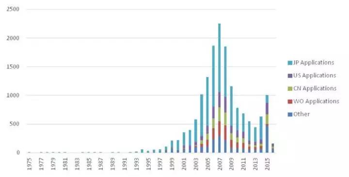 截至2017年5月12日,豐田汽車(chē)已在21個(gè)國(guó)家和地區(qū)、2個(gè)國(guó)際知識(shí)產(chǎn)權(quán)組織申請(qǐng)了15867件與燃料電池相關(guān)的專(zhuān)利。2004年到2009年,豐田汽車(chē)與燃料電池相關(guān)的專(zhuān)利申請(qǐng)數(shù)量大幅增長(zhǎng),期間該技術(shù)領(lǐng)域年均專(zhuān)利申請(qǐng)量為1895件,說(shuō)明豐田汽車(chē)在這幾年開(kāi)展了大量氫燃料電池技術(shù)研究。2009年后,豐田汽車(chē)與燃料電池相關(guān)的專(zhuān)利申請(qǐng)數(shù)量逐漸下降,年申請(qǐng)量回落到500件左右。直到2014年,專(zhuān)利申請(qǐng)數(shù)量再度回升,2015年的專(zhuān)利申請(qǐng)量重新回到1000件以上,表明當(dāng)下豐田公司對(duì)燃料電池技術(shù)研究的熱情逐漸回升,未來(lái)可能有較多新技術(shù)和新產(chǎn)品面世。