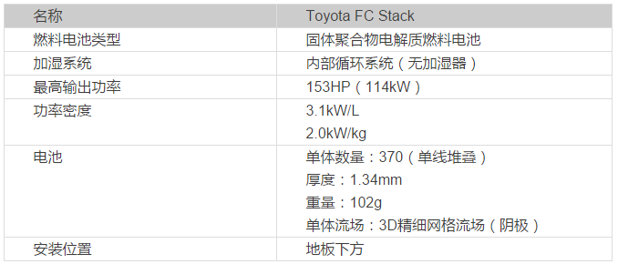 Mirai的燃料電池為固體聚合物電解質(zhì)燃料電池(Solid polymer electrolyte FC),最大輸出功率為114千瓦,由370片電池組成,重量?jī)H56kg,體積僅37L。體積功率密度和質(zhì)量功率密度分別為3.1kW/L,2.0kW/kg,升壓變頻器負(fù)責(zé)將電壓提升至650V,以滿足高性能電動(dòng)機(jī)的需求,處于世界領(lǐng)先水平。除了為汽車(chē)提供動(dòng)力外,Mirai的燃料電池堆還可以為其他設(shè)備供電,Mirai可以作為備用發(fā)電機(jī)使用。