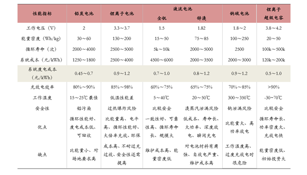 主流儲能電池性能指標(biāo)比較