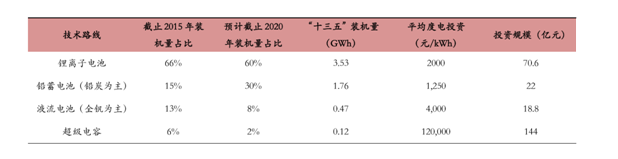 國家能源局最新發(fā)布的《電力發(fā)展“十三五”規(guī)劃(2016-2020 年)》中提到,“十三五”期間,風(fēng)電新增投產(chǎn) 79GWh 以上,太陽能發(fā)電新增投產(chǎn) 68GWh 以上,即到 2020 年全國風(fēng)電裝機達到 210GWh 以上,其中海上風(fēng)電 5GWh 左右; 太陽能發(fā)電裝機達到 110GWh 以上,其中分布式光伏 60GWh 以上、光熱發(fā)電 5GWh。預(yù)計以風(fēng)光發(fā)電中新增 裝機量的 20%為基數(shù),按 10%的功率比例配置儲能系統(tǒng),則儲能裝機量將達到 2.94GW,若每天存放 2 小時即對應(yīng) 5.88GWh 新能源發(fā)電儲能規(guī)模。另據(jù) CNESA 發(fā)布的《儲能產(chǎn)業(yè)研究白皮書 2016》顯示,2015 年國內(nèi)化學(xué)儲能項目(不含抽水蓄能、壓縮空氣和 儲熱)累計裝機規(guī)模 105.5MW,以鋰離子電池、鉛蓄電池、液流電池及超級電容為主,占比分別為 66%、15%、13%、 6%。預(yù)計未來受益于鉛蓄電池(鉛炭為主)儲能成本優(yōu)勢,其裝機量占比將有所提高,如表 5 所示,參照上述 測算的“十三五”期間新能源發(fā)電配套儲能規(guī)模約為 5.88GWh,則對應(yīng)配套儲能投資規(guī)約 255 億元。