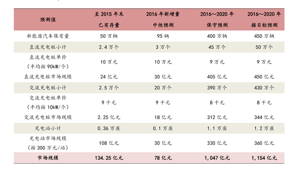 依據(jù)當(dāng)前全國充電樁建設(shè)進度,中性預(yù)測,2016 年充電樁新增市場規(guī)模約 78 億元(含充電站基建投入),如 表 6 所示,若以《發(fā)展指南》中的“十三五”期間建設(shè)目標(biāo)為準(zhǔn),直流充電樁新增 50 萬個、交流充電樁新增 430 萬個、 充電站新增 1.2 萬座,對應(yīng)投資規(guī)模分別為 450 億元、344 億元、360 億元,即“十三五”期間新增市場規(guī)模約 1,154 億元,保守也有 1047 億元,對應(yīng)充電設(shè)備中的儲能模塊市場不到 100 億元。