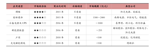 目前最具市場經(jīng)濟性的是傳統(tǒng)電網(wǎng)削峰填谷,已經(jīng)可以實現(xiàn)無補貼的商業(yè)化推廣,若“十 三五”期間在大型工業(yè)城市投資儲能項目,則市場規(guī)模有望達到 1500~2400 億元,此外,未來若在大型工業(yè)省份全面 推廣儲能,則市場規(guī)模更可觀;后備電源及 UPS 儲能也不需要補貼,市場規(guī)模約為 1000 億元;新能源發(fā)電可按一定 比例配套儲能,市場規(guī)模約為 255 億元,但尚需補貼;另外,戶用儲能和充儲放一體化充電站等市場規(guī)模不到 100 億 元,且需要補貼才能推廣。綜上所述,傳統(tǒng)電網(wǎng)削峰填谷將是未來五年最大的儲能市場。