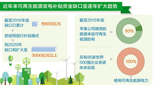 “綠證交易今后會是一個趨勢,因為可再生能源補貼愈發(fā)捉襟見肘?!币总S春介紹說,目前我國可再生能源發(fā)電補貼資金來源單一,均來自電價附加征收。近年來補貼資金缺口呈逐年擴大趨勢。截至2016年底,缺口已累計約600億元;若按照現(xiàn)行補貼模式,到2020年缺口將擴大至3000億元以上。目前國家在努力降低實體經(jīng)濟成本,大幅提高電價附加標準并不現(xiàn)實。
