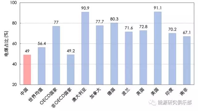 大力發(fā)展非化石能源,大力推進(jìn)化石能源清潔高效利用,是邁向綠色低碳能源發(fā)展道路的兩個(gè)重要戰(zhàn)略途徑。我國(guó)煤炭資源相對(duì)豐富,約占一次能源消費(fèi)總量的64%。以煤為主的資源稟賦,決定了我國(guó)能源向低碳化轉(zhuǎn)型任務(wù)的艱巨性和長(zhǎng)期性。燃煤發(fā)電排放的常規(guī)污染物(煙塵、二氧化硫、氮氧化物)經(jīng)過(guò)嚴(yán)格治理,已不是制約電力轉(zhuǎn)型發(fā)展的關(guān)鍵因素。在我國(guó)以PM2.5為主要特征的霧霾型空氣污染仍然十分嚴(yán)重的情況下,要解決好約7億噸散燒煤污染空氣環(huán)境的問(wèn)題,需要大力提高電煤在煤炭消費(fèi)中的比重。我國(guó)電煤占煤炭消費(fèi)比重多年來(lái)一直在50%左右,遠(yuǎn)低于國(guó)外發(fā)達(dá)國(guó)家甚至是世界平均水平,如歐盟81.7%、德國(guó)85.7%、英國(guó)82.1%、美國(guó)92.8%(見(jiàn)圖5)。未來(lái)一個(gè)時(shí)期煤電仍將是我國(guó)的主體電源,要做好煤電發(fā)展規(guī)劃,發(fā)揮好煤電在系統(tǒng)中的作用。2010年時(shí),煤電占全國(guó)總裝機(jī)的比重為71%、占總發(fā)電量的比重為78%;根據(jù)《電力發(fā)展“十三五”規(guī)劃》,到2020年,煤電裝機(jī)將達(dá)到11億千瓦,占全國(guó)總裝機(jī)的比重下降到約55%、發(fā)電量的比重下降到約62%。新能源發(fā)電出力波動(dòng)性大,而我國(guó)調(diào)節(jié)能力好的水電站、抽水蓄能電站、燃?xì)怆娬镜褥`活調(diào)節(jié)電源比重低,系統(tǒng)調(diào)節(jié)主要依靠煤電機(jī)組,要加大實(shí)施煤電機(jī)組靈活性改造,進(jìn)一步提高調(diào)解能力,更好地服務(wù)新能源發(fā)展。同時(shí),要嚴(yán)格控制煤電發(fā)展增量,嚴(yán)格防止煤電的“碳鎖定”效應(yīng)。根據(jù)中電聯(lián)分析,中國(guó)在役煤電機(jī)組平均運(yùn)行年齡約為11年,這比美國(guó)平均運(yùn)行年齡約為38年要小得多,長(zhǎng)期碳減排壓力更大。