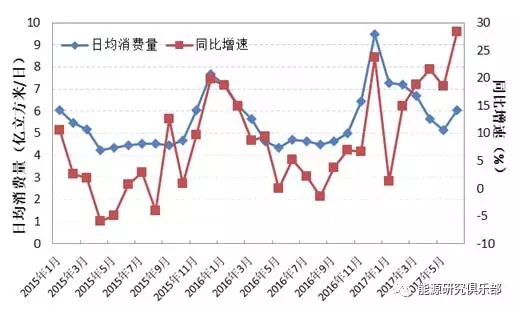 圖3 我國(guó)天然氣消費(fèi)量(2015年1月至2017年6月)