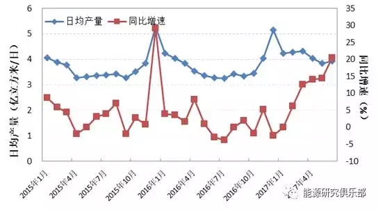 圖4 我國(guó)天然氣生產(chǎn)情況(2015年1月至2017年6月)