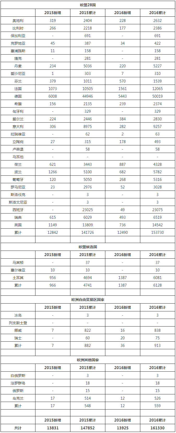 表1 2015-2016歐洲各國新增和累計裝機統(tǒng)計(MW)