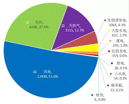 圖2 2016年歐盟新增電力裝機構(gòu)成(MW,%)