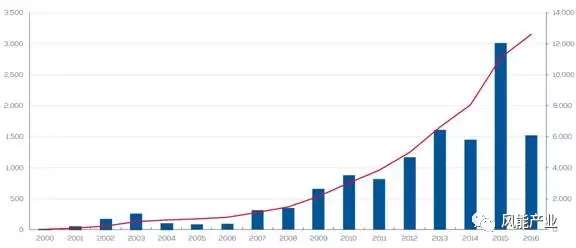 圖5 2000-2016年歐洲歷年新增、累計并網(wǎng)海上風(fēng)電機組容量(MW)