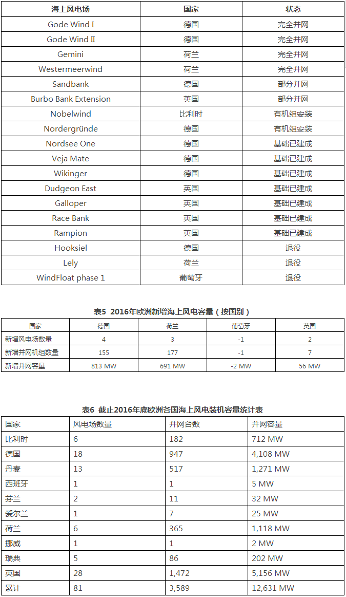 六、2016歐洲各國海上風(fēng)電場新增裝機詳情