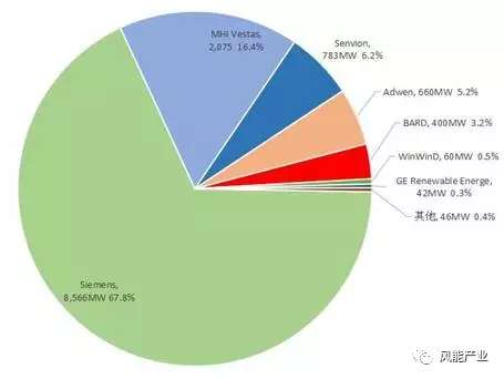 從歐洲累計安裝的海上風(fēng)電機組容量來看,Siemens占到了累計安裝容量的67.8%,接下來是MHI Vestas的16.4%、Senvion的6.2%、Adwen 的5.2%和BARD的3.2%。