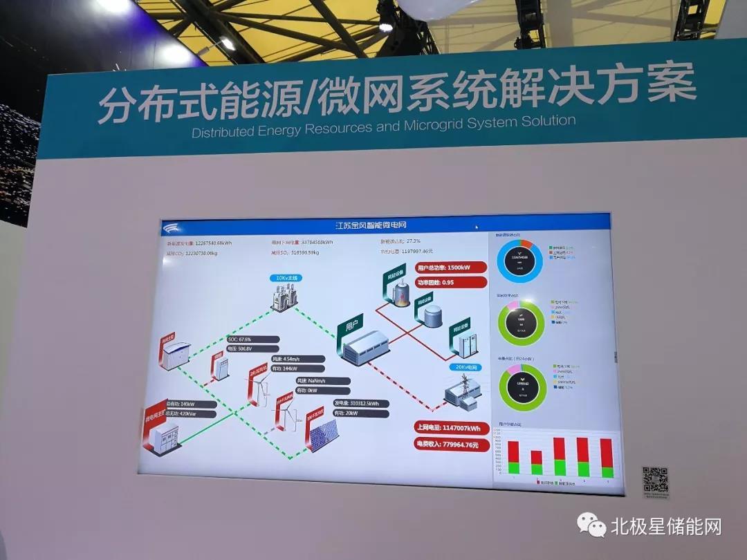 本次展會上展出的分布式能源/微網系統(tǒng)解決方案以江蘇金風智能微電網為例,顯示上網電量為1147007KWh,電費收入779964.76元,解決方案應用形式包括分布式光伏解決方案、分散式風電解決方案、智能微網解決方案、儲能系統(tǒng)解決方案、燃氣三聯供解決方案。