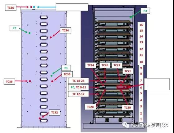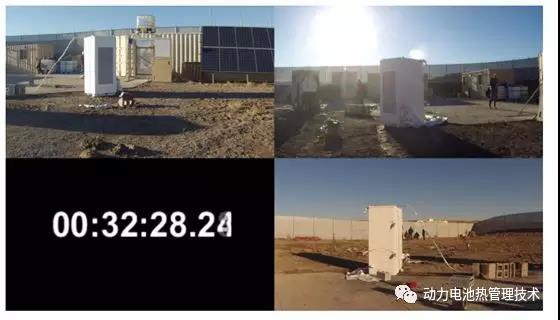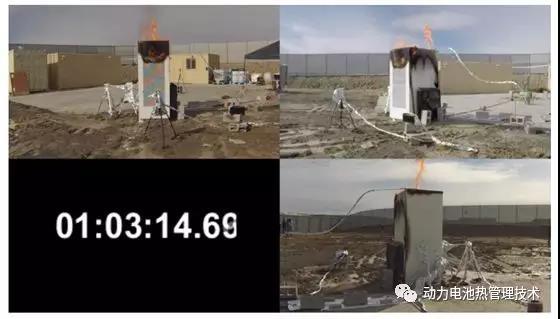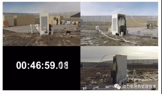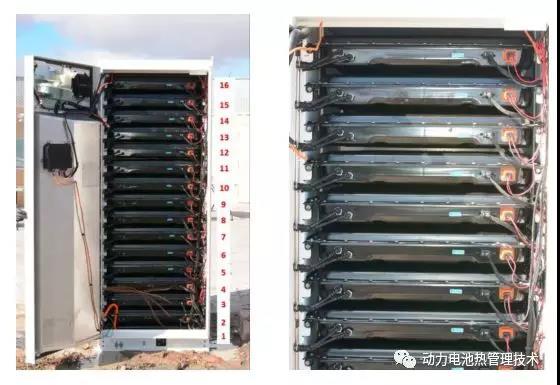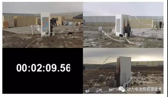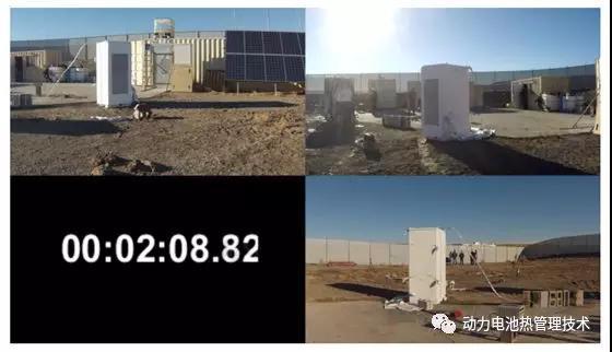 閑話少說(shuō),直接看實(shí)驗(yàn)過(guò)程,儲(chǔ)能系統(tǒng)布置在空曠的室外,采用兩個(gè)100KWh的儲(chǔ)能單元,實(shí)驗(yàn)前電池處于滿電態(tài),分別對(duì)電池進(jìn)行外部及內(nèi)部加熱,觸發(fā)電池?zé)崾Э兀蛊浒l(fā)生燃燒甚至爆炸。