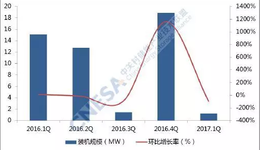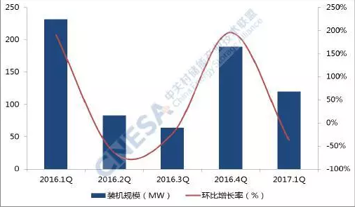 圖4連續(xù)五個季度新增投運項目的裝機分布及環(huán)比增長率(中國)