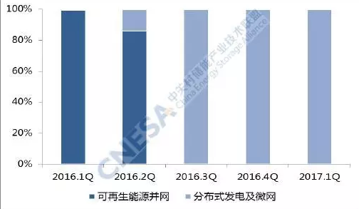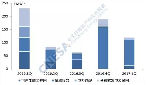 從應(yīng)用分布上看,投運項目在輔助服務(wù)領(lǐng)域的裝機規(guī)模最大,為99.1MW,同比增長87%,環(huán)比2016年四季度下降38%。