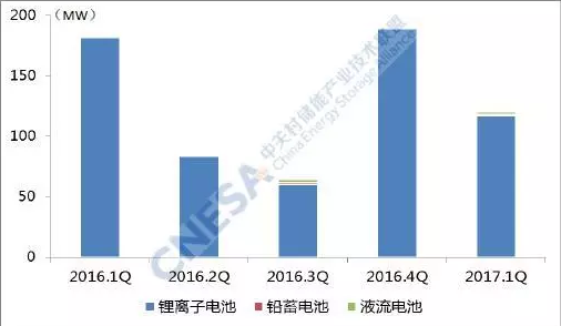 從技術(shù)分布上看,投運項目中,鋰離子電池的裝機規(guī)模最大,為117.1MW,同比下降35%,環(huán)比2016年四季度下降38%。