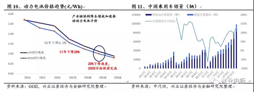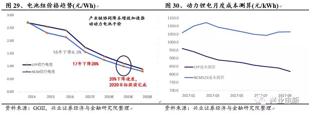2019-2020雙積分政策接力補(bǔ)貼政策,中外合資達(dá)產(chǎn)市場全面競爭,電動(dòng)車降本迎平價(jià)時(shí)代:2017年全年動(dòng)力電池組價(jià)格平均下降幅度達(dá)28%,整體產(chǎn)業(yè)鏈協(xié)同降本增效的反應(yīng)加速。電芯成本LFP當(dāng)前已經(jīng)接近0.8元/Wh,三元電芯1元/Wh,離2020年0.6元/Wh的成本平價(jià)目標(biāo)已經(jīng)接近。2020年電動(dòng)車平價(jià)在望。同時(shí)雙積分政策接力疊加中外合資車企產(chǎn)能落地全面加入競爭,進(jìn)一步助推市場熱情。