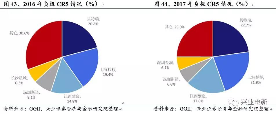 格局:2017年CR5占比77%,CR3占比60%,馬太效應(yīng)進(jìn)一步強(qiáng)化。價(jià)格:人造石墨受環(huán)保限產(chǎn)影響漲跌互現(xiàn),長期價(jià)格下降趨勢穩(wěn)定。技術(shù):能量密度要求加速硅碳負(fù)極布局。