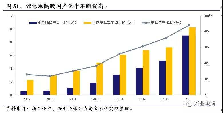 隔膜整體國產(chǎn)率2016年已達(dá)88%,2017年產(chǎn)能建設(shè)全面加速,2018年底全國產(chǎn)能將超80億平,行業(yè)屆時(shí)將進(jìn)入結(jié)構(gòu)性產(chǎn)能過剩階段。