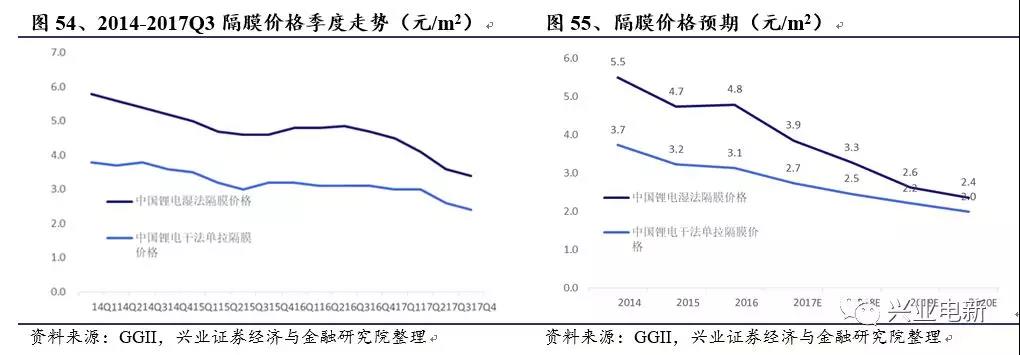 2016年與2015年的價(jià)格相對持平,而濕法與干法單拉2017年的預(yù)期均價(jià)將同比下降20%與12%。2018年與2019年的濕法隔膜的價(jià)格將預(yù)期每年下降20%左右,2020年下降10%-20%。