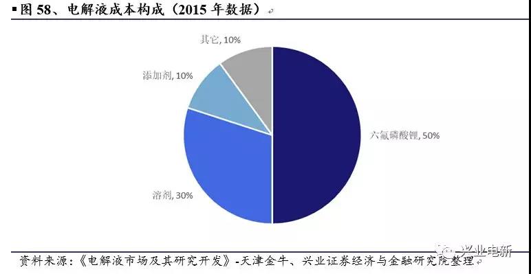 電解液是鋰離子電池中起到鋰離子傳輸?shù)拿浇榈淖饔茫哂休^高的離子電導(dǎo)率與極好的電子絕緣性,在電芯中的成本占比約為6-10%。當(dāng)前主要使用的電解液由三部分組成,有機(jī)溶劑,溶質(zhì)六氟磷酸鋰(LiPF6)以及添加劑。電解液中溶質(zhì)與溶劑的配比一般為1:6.5左右:一噸電解液中一般含有0.13噸的LiPF6與0.85噸的溶劑。電解液的成本主要因素為LiPF6,成本占比超過40%,溶劑成本雖有波動(dòng),但整體影響并不大,添加劑價(jià)格穩(wěn)定,成本由用量決定。