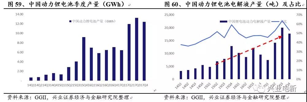 電解液于2015年前的主要需求驅(qū)動(dòng)力來自消費(fèi)鋰電池,2015年Q2開始,中國新能源車市場的啟動(dòng)拉動(dòng)了動(dòng)力電解液需求的快速增長。從下圖可以看出,2014年中國動(dòng)力電解液占比僅為40%左右,2015年到2016年提升至50%,2017年Q3提升至近60%。由于消費(fèi)鋰電的增長已經(jīng)趨于平穩(wěn),儲能鋰電的體量相對較小,中國未來的電動(dòng)車市場將主力拉動(dòng)電解液需求的上揚(yáng)。