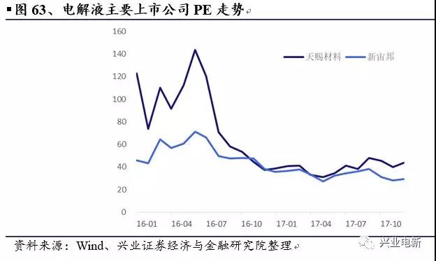 從下圖可以看出,主要業(yè)務(wù)為電解液的兩家上市公司天賜材料及新宙邦的PE均于2016年的5-6月份達(dá)到高峰,之后迅速下滑,2017年處于盤整期。