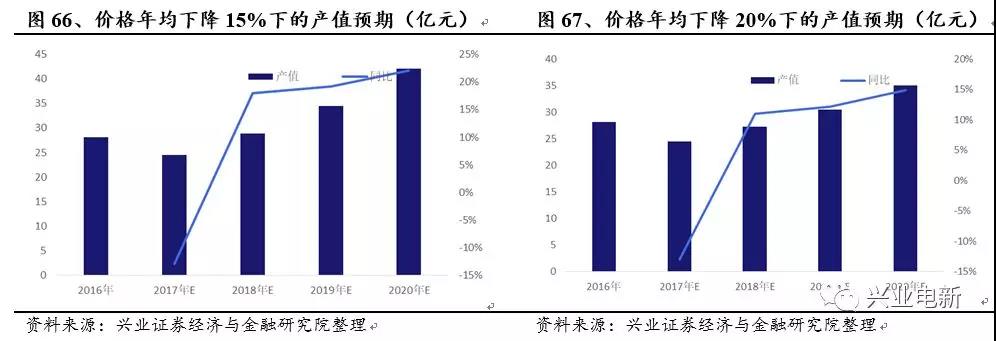 產(chǎn)值方面,假設(shè)2018年開始電解液價(jià)格每年下降約15%-20%,從下圖可以看出,由于2017年動(dòng)力電池電解液的需求量同比增幅僅為約20%,全年電解液均價(jià)下降高達(dá)29%,使得2017年的動(dòng)力電解液產(chǎn)值同比有所下滑。2018年起的動(dòng)力電池電解液需求增量同比開始提升,價(jià)格下降進(jìn)入有序的通道,整體動(dòng)力電解液產(chǎn)值回到上升通道。在15%-20%的年降幅預(yù)期下,動(dòng)力電解液市場的產(chǎn)值均可以于2018年達(dá)到2016年水平,并加速向上。