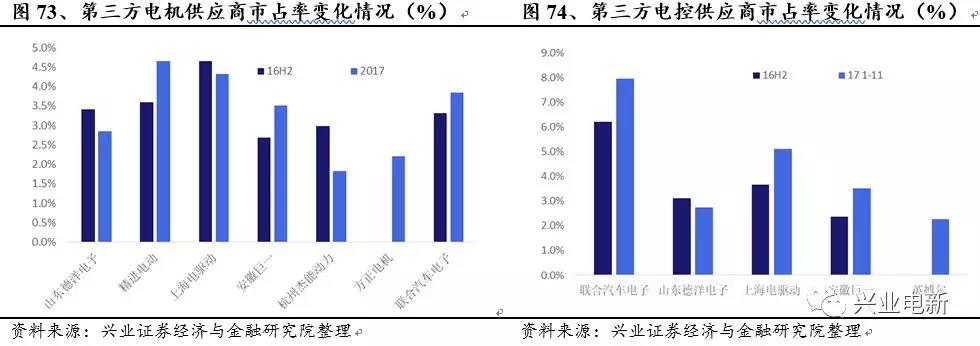下圖節(jié)選了進(jìn)入2017年1-11月累計(jì)裝機(jī)前五的電機(jī)及電控第三方供應(yīng)商,并對其市場占有率進(jìn)行了整理。電機(jī)方面,市場占有率上升的僅有方正電機(jī),安徽巨一,精進(jìn)電動(dòng)及聯(lián)合汽車電子。而電控方面獨(dú)立供應(yīng)商僅有五家進(jìn)入前10,聯(lián)合汽車電子,上海電驅(qū)動(dòng),安徽巨一及英博爾均錄得市場占有率的提升。
