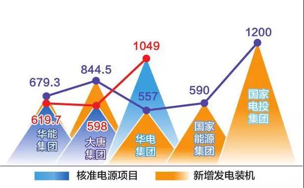 2017年,華能集團(tuán)核準(zhǔn)低碳清潔能源項(xiàng)目619.7萬千瓦;投產(chǎn)新機(jī)679.3萬千瓦,其中投產(chǎn)低碳清潔能源裝機(jī)532.3萬千瓦。大唐集團(tuán)全年完成核準(zhǔn)電源項(xiàng)目598萬千瓦,清潔能源占比60.67%;全年投產(chǎn)發(fā)電容量844.5萬千瓦,清潔能源占比55.31%。華電集團(tuán)全年核準(zhǔn)電源項(xiàng)目1049萬千瓦,均為清潔能源;投產(chǎn)557萬千瓦。國家能源集團(tuán)新投產(chǎn)裝機(jī)590萬千瓦。國家電投集團(tuán)新增電力裝機(jī)1200萬千瓦,其中新能源投產(chǎn)裝機(jī)673萬千瓦,創(chuàng)歷史新高。