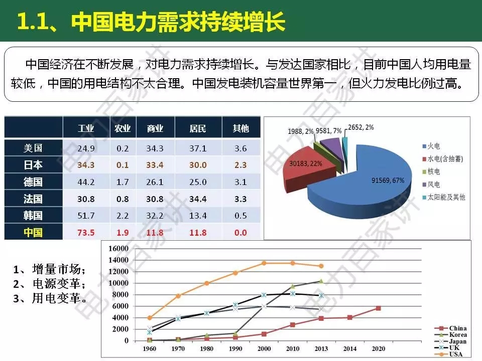 近期中國電力科學院惠東教授發(fā)表了題為《電力儲能發(fā)展趨勢預判》的報告。他在報告中大膽預判中國將成為未來儲能需求規(guī)模最大的國家。增長的動力一方面將來自于平衡可再生能源發(fā)電的需求;一方面將來自于電力負荷的增長,惠東預計匹配發(fā)達國家的用電水平,我國人均用電量要大約翻一倍,達到人均8000~9000度左右(目前是人均4000度多),這個過程中,如果按照傳統(tǒng)的擴容思路,電網(wǎng)要照現(xiàn)在的2.5倍的規(guī)模來建設。而引入儲能將有效延緩設備更新投資,提高網(wǎng)絡資源和設施利用率。