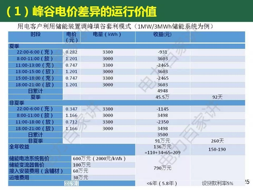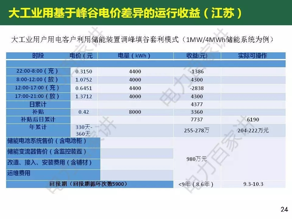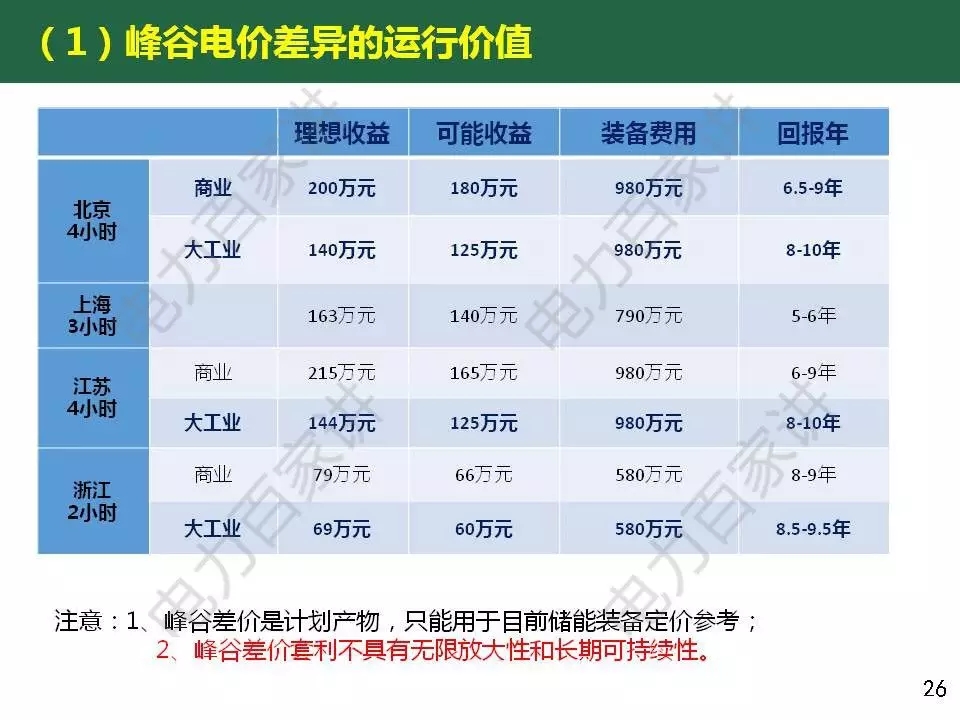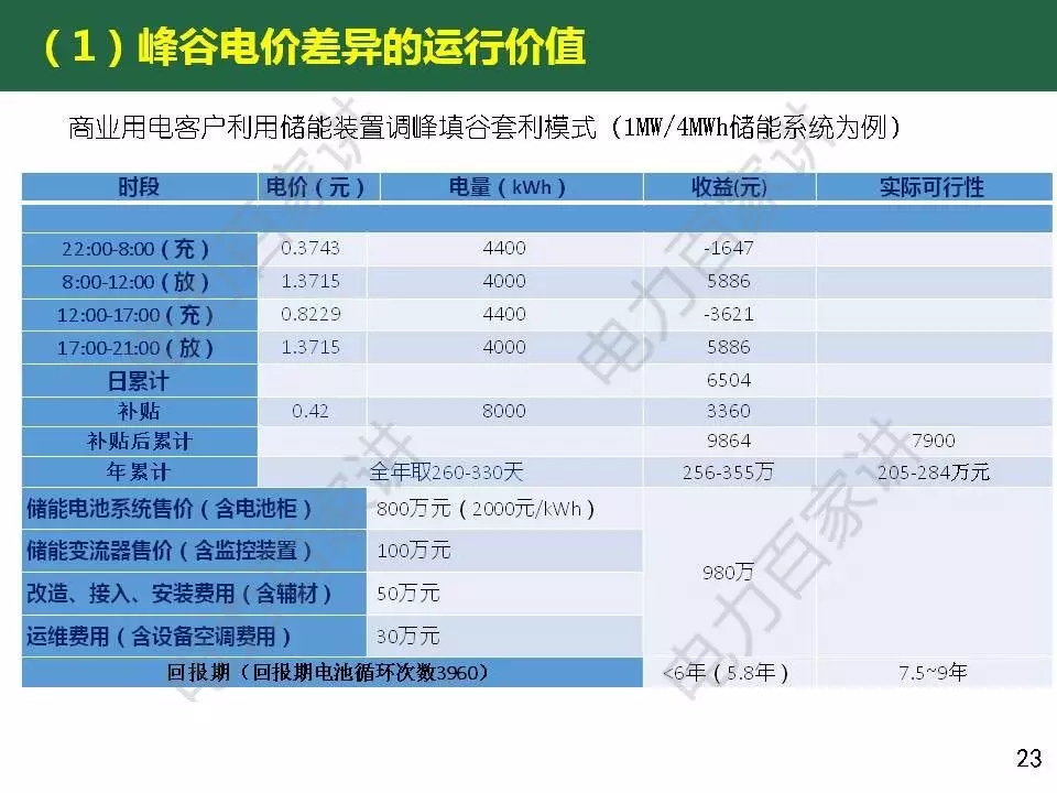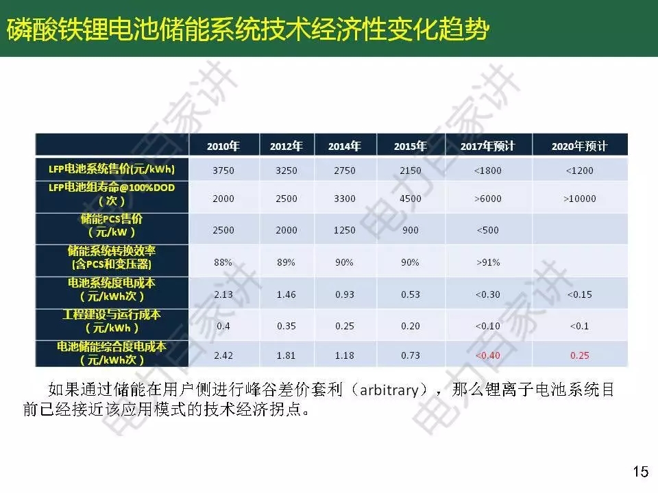 惠東教授還對目前商業(yè)化初期的儲能應用經(jīng)濟性進行了分析,他表示峰谷電價差套利的模式,價差要達到6毛以上,如果要在5年內(nèi)收回成本,電池系統(tǒng)價格要降到1.2元/wh以下(目前鋰電池系統(tǒng)價格在2000元/ kWh);解決棄風問題的儲能應用不具備經(jīng)濟價值,即使儲能價格再下降一半。