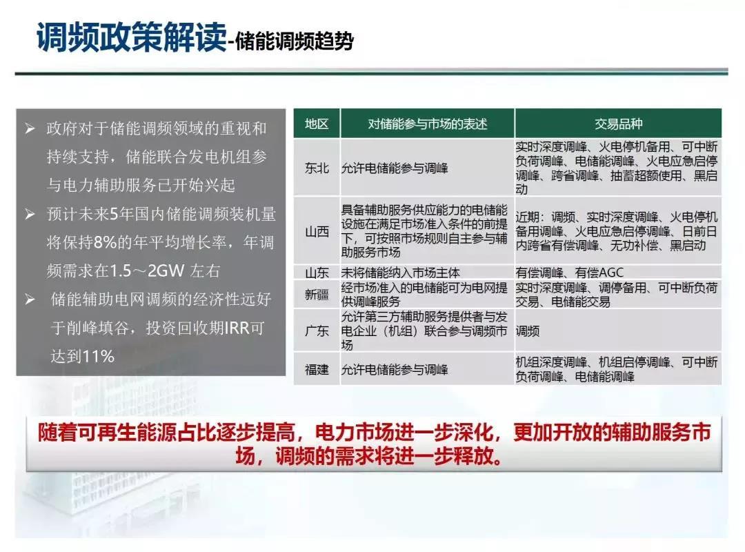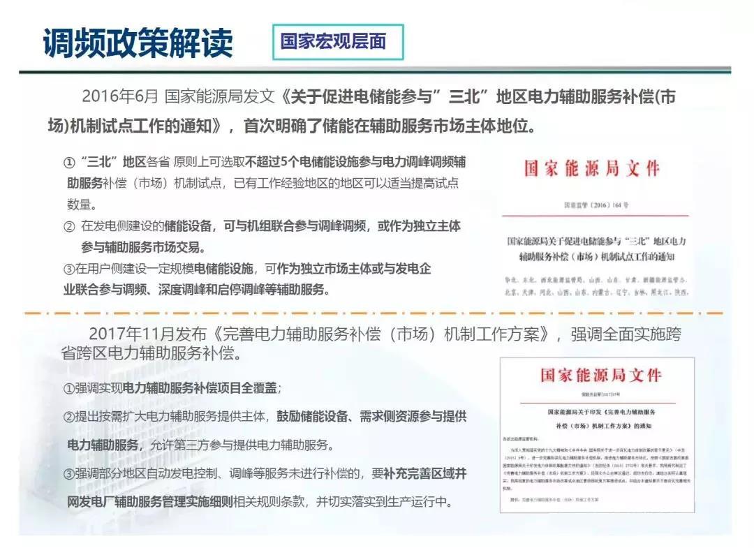 2016年6月《關(guān)于促進(jìn)電儲(chǔ)能參與”三北”地區(qū)電力輔助服務(wù)補(bǔ)償(市場(chǎng))機(jī)制試點(diǎn)工作的通知》;2017年11月《完善電力輔助服務(wù)補(bǔ)償(市場(chǎng))機(jī)制工作方案》。這兩個(gè)文件從國(guó)家層面給了儲(chǔ)能一個(gè)明確的定位,即國(guó)家政策上支持儲(chǔ)能參與調(diào)頻,包括允許第三方提供電力輔助服務(wù)。